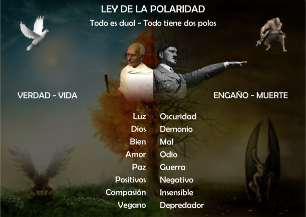 Todo tiene dos polos. Todo es doble, todo tiene dos polos; todo. Todas las cosas tiene su par de opuestos: los semejantes y los antagónicos son lo mismo; los opuestos son idénticos en naturaleza, pero diferentes en grado; los extremos se tocan. Los extremos se unen; todas las verdades son también medias-verdades; todas las paradojas pueden ser unidas. Implica que absolutamente todo tiene dos caras. Incluso aquello que aparentemente son contrarios, son en realidad los dos extremos de la misma cosa. El amor y el odio, el frío y el calor, la paz y la guerra, el bien y el mal, la luz y la oscuridad, la belleza y la fealdad, el nacimiento y la muerte, en realidad, no son contrarios sino complementarios; son todos variaciones de lo mismo, en distintos niveles de vibración. «Dios y Demonio» son polos de lo mismo.