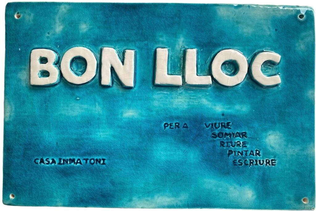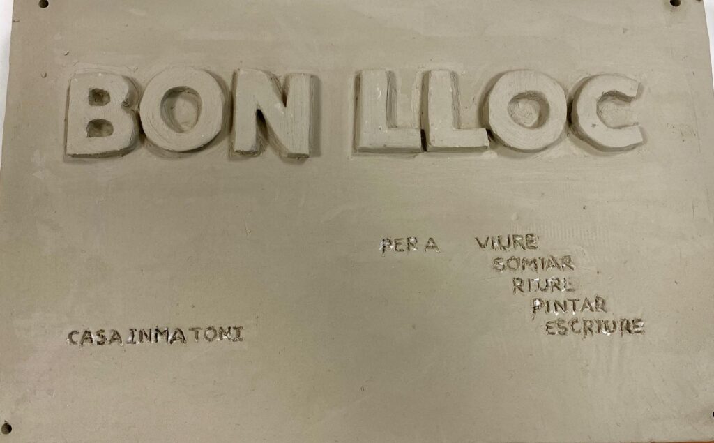 Este es el resultado de esa primera fase. En la placa se puede leer el nombre “BON LLOC”en relieve, y debajo a la derecha: “ PER A VIURE, SOMIAR, RIURE, PINTAR, ESCRIURE” y a la izquierda más abajo: “CASA INMA TONI”, todo esto realizado con un punzón.